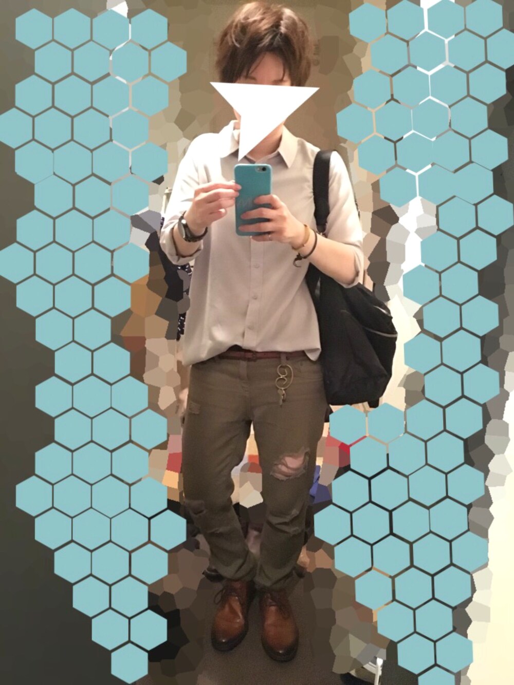 キレイめシャツにダメージのパンツを合わせてみました。同系色コーデ、好きです。 調子に乗ってシャツの前だけインしてみました( ̄▽ ̄)v