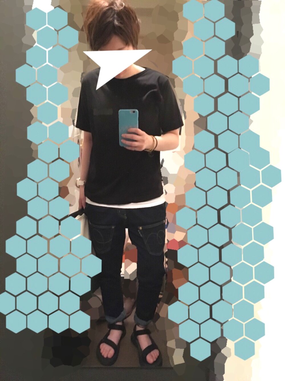 Tシャツ+デニム+サンダルで楽ちんスタイル。