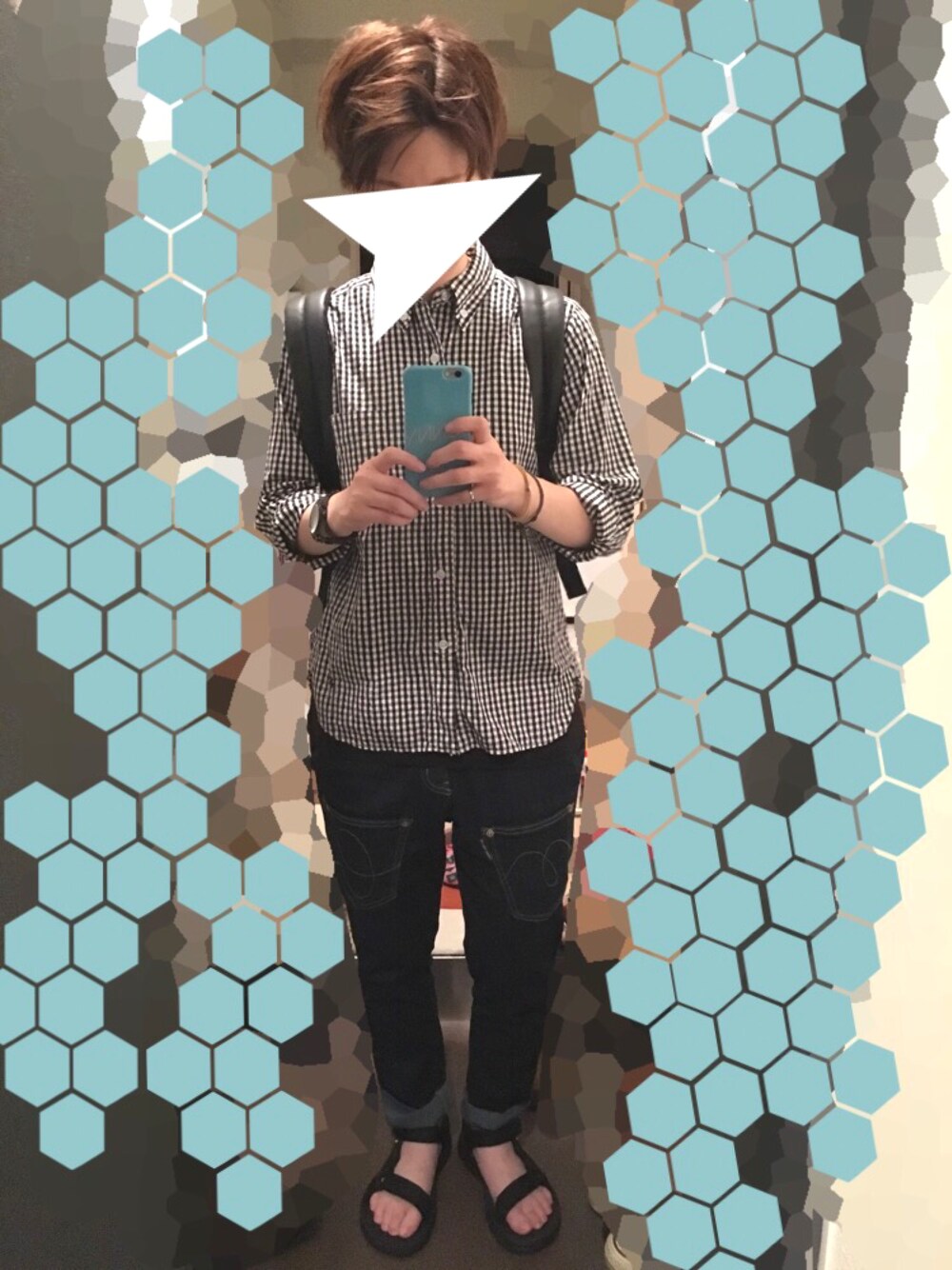 今年買ったサルエルパンツ、めっちゃ楽で履きやすい。ポケット可愛いし。 ギンガムチェック×リュックのコーデが好きです(^^)