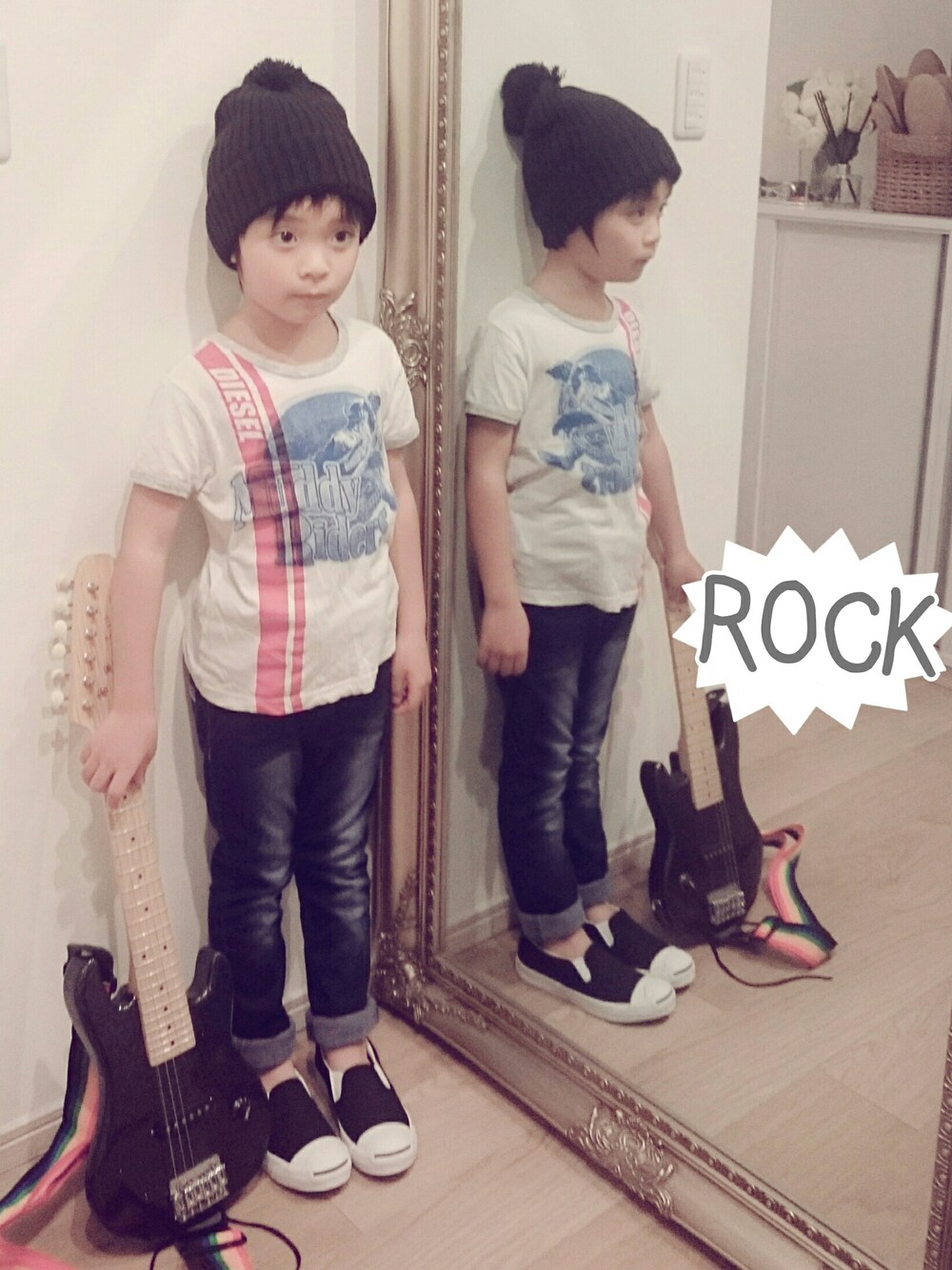 3歳のサンタさんプレゼントはエレキギター🎸エフェクター付きの、わりとがんばるキッズ用です笑 赤ちゃんの頃から私がたまにいろいろなライブDVDを見てたせいか、なぜかボーカルではなく、男子はギタリストに憧れるらしい☺でも衣装はボーカルっぽい、、 じいじが軽音楽やってたので、教わりつつジャガジャガ 男子はギターに惹かれるのねー🌟