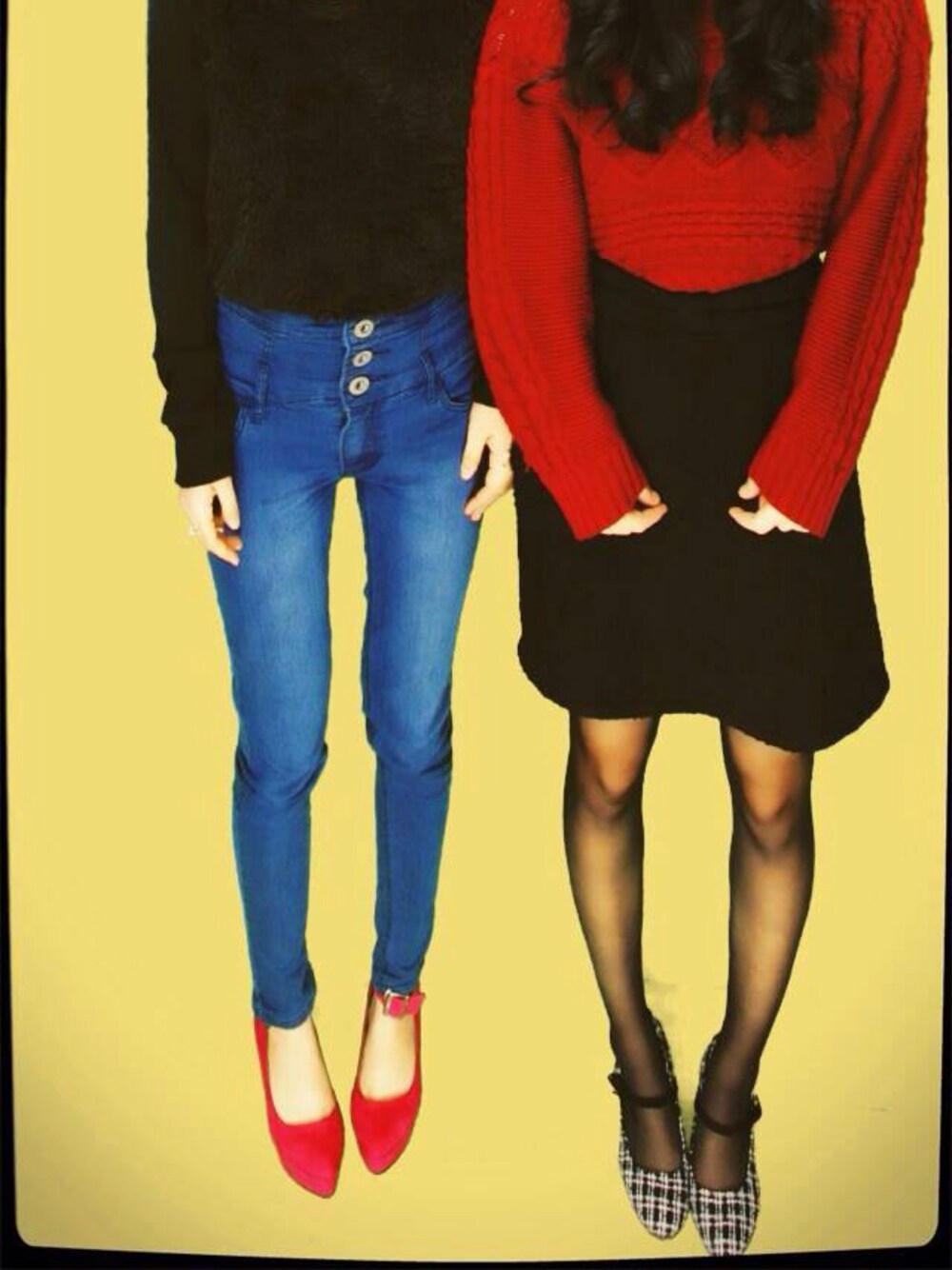 右のコーデです👗 オーソドックスなコーデですが、やっぱり赤のニットは可愛い♩本当はグレーのニット帽も被ってます‼︎