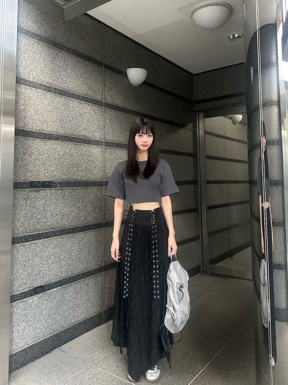 カジュアルな無地Tシャツも一癖あるロングスカートと合わせて大人っぽく🙂↕️🩶