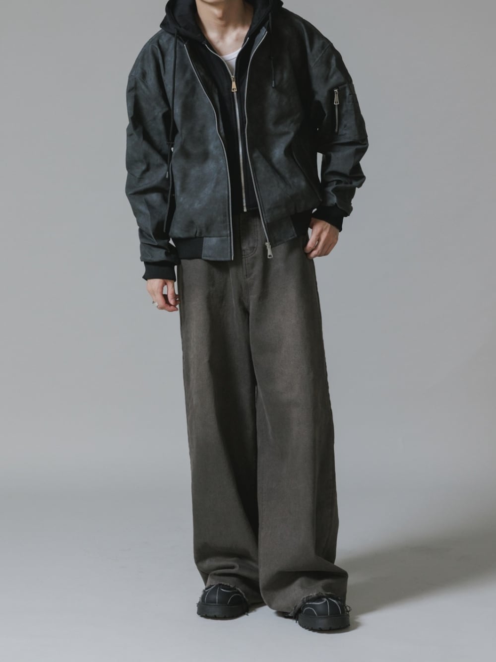 桃(ROOPTOKYO)のMA-1「Layered-Style Hooded Leather Jacket / レイヤード風 フード付き レザーブルゾン」を使ったコーディネート