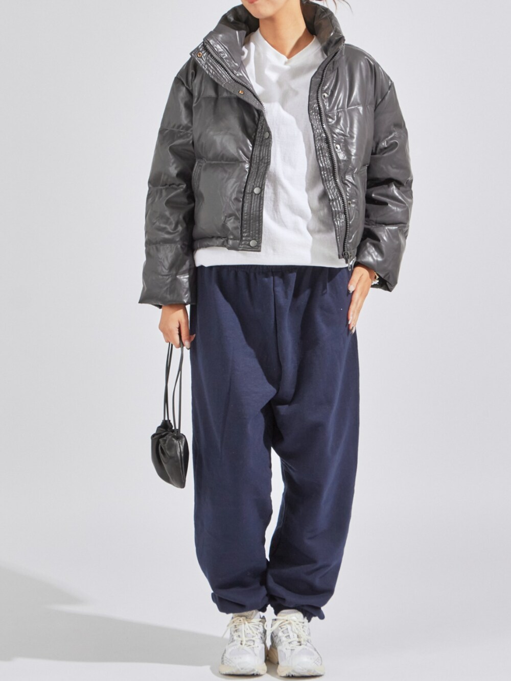 桃(ROOPTOKYO)のダウンジャケット/コート「faux leather puffer jacket / フェイクレザーダウンジャケット」を使ったコーディネート