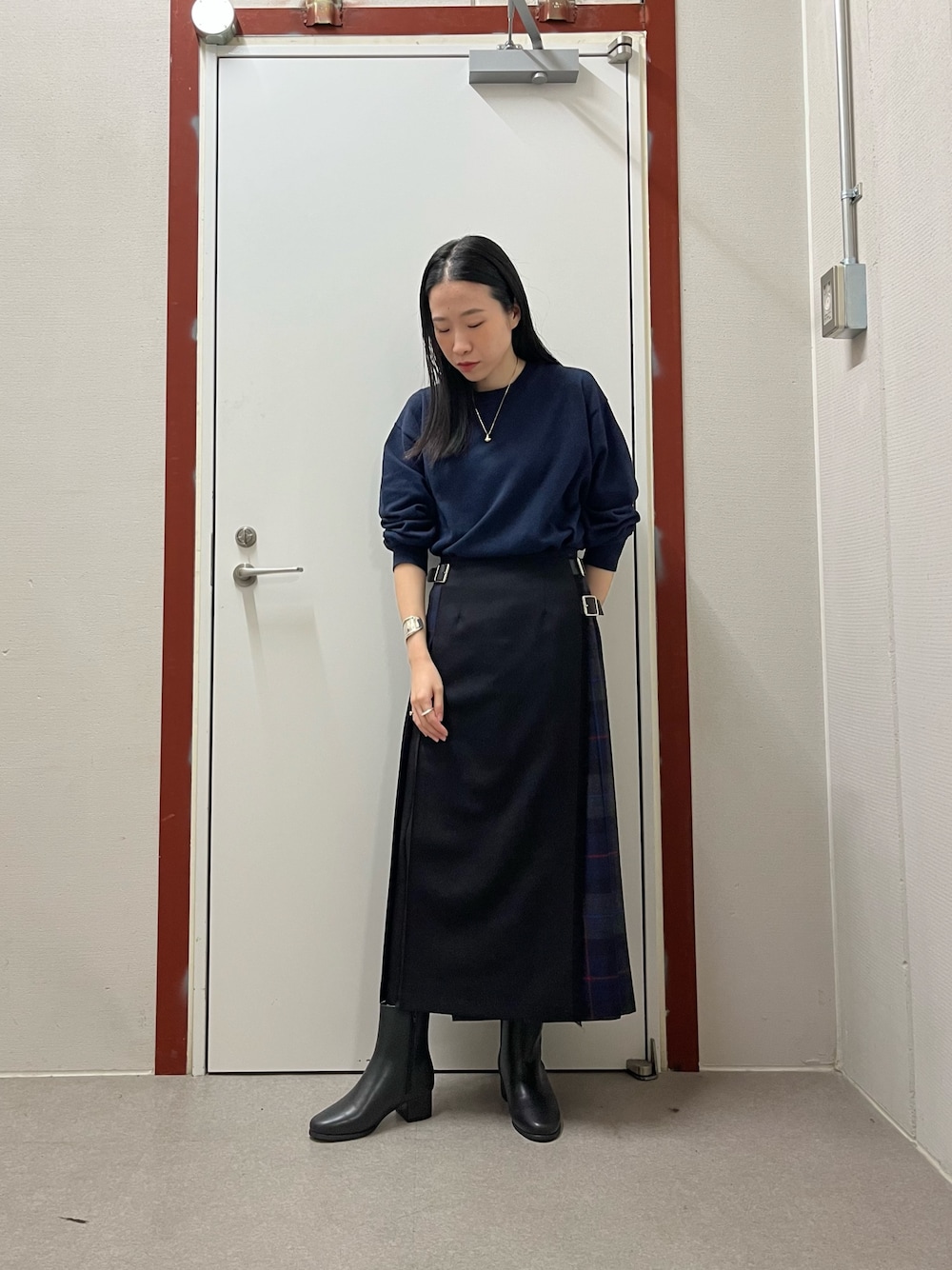 ネイビーのチェックに合わせて上のニットもブルー系をチョイスしました! スカートはサイズ調整がしやすくシンプルに着るだけでしっかりと可愛いです!!!