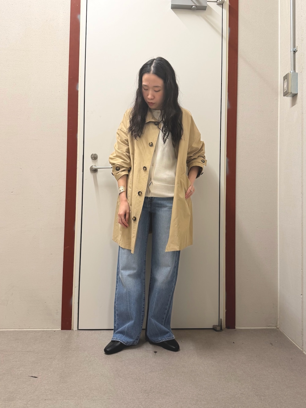 白インナー+デニムにベージュコートの落ち着くコーディネートです。スタンドミドルコートは、撥水加工が施されており汚れが気になりにくいので日常使いにバッチリです!!