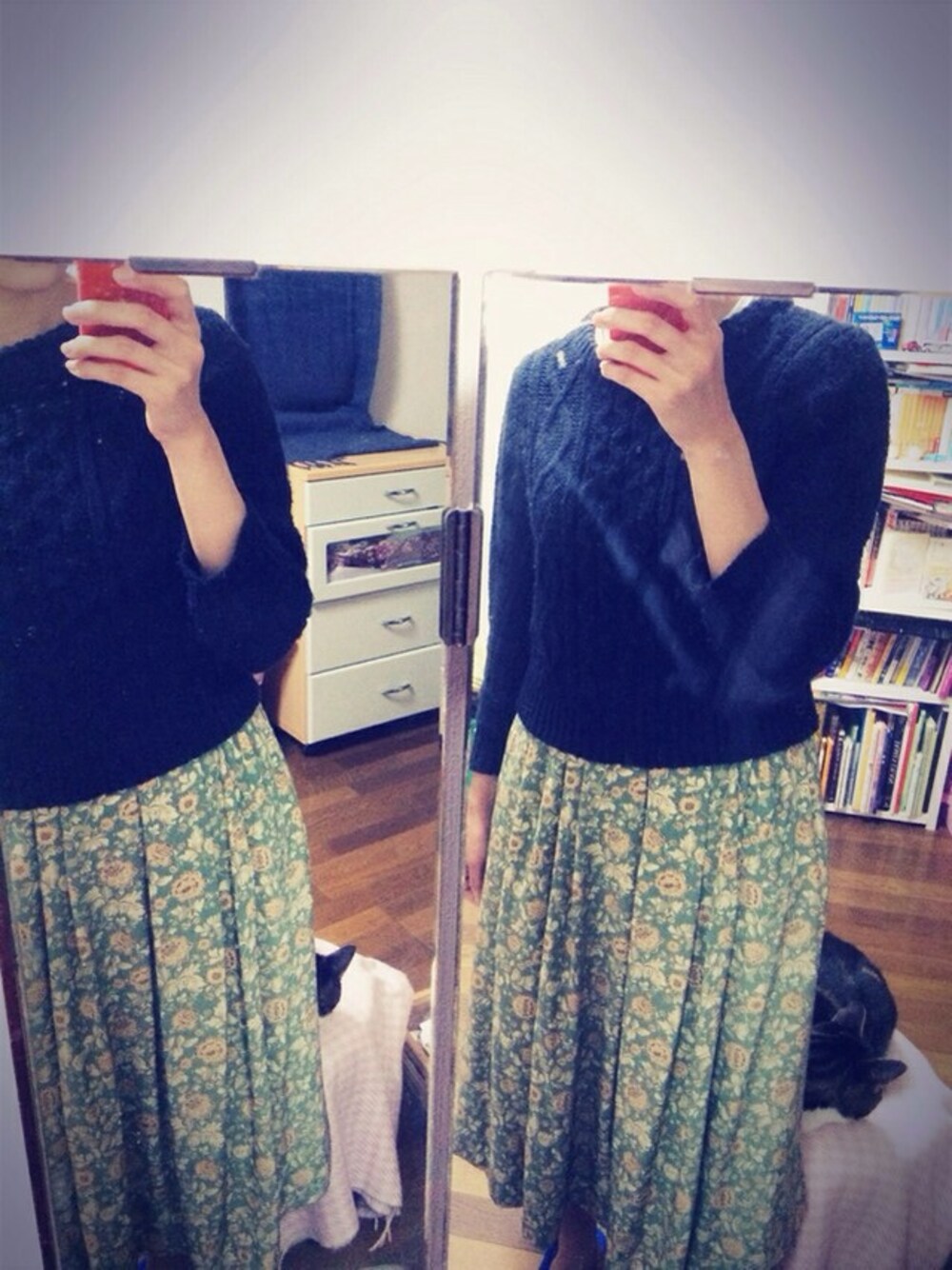 tops/used skirt/used 古着コーデです。 白いフラットシューズを合わせました。 おばあちゃん、とか、昔っぽい、とか、ダサい、とか、そんなんすきです。 でもたま~には、キリッとかっこいい格好して、気分転換もイイ