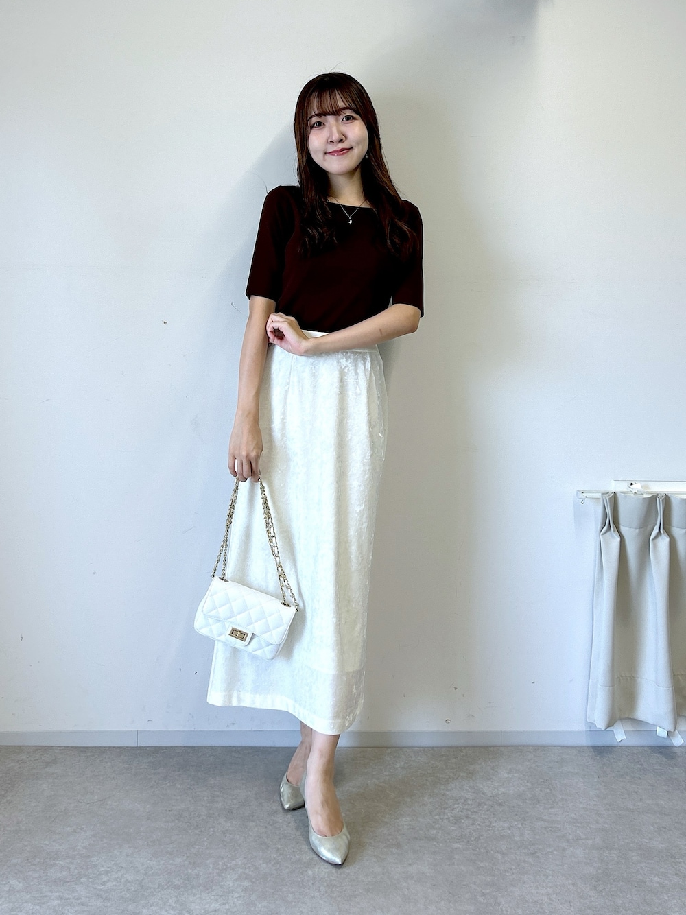 クールタッチ5分袖ニットに新色登場! 【トップス】 前回も人気だったクールタッチ5分袖ニットに新色が登場! 今回はブラウンをチョイスしました。 他のシリーズのブラウンと同色で、落ち着いた高級感あるカラー。 5分袖なので秋口も丁度いい! 程よく体のラインを拾ってくれて美しいシルエットできて頂けます。 【スカート】 新作のベロアスカート。 クラッシュさせたベロアの質感で、 しっかりしすぎずカジュアルにも着れる万能アイテム。 ナローシルエットが綺麗なラインで すっきりした印象に。 スッキリな丈感なので冬場のブーツ合わせもおすすめ! skirt♡38size