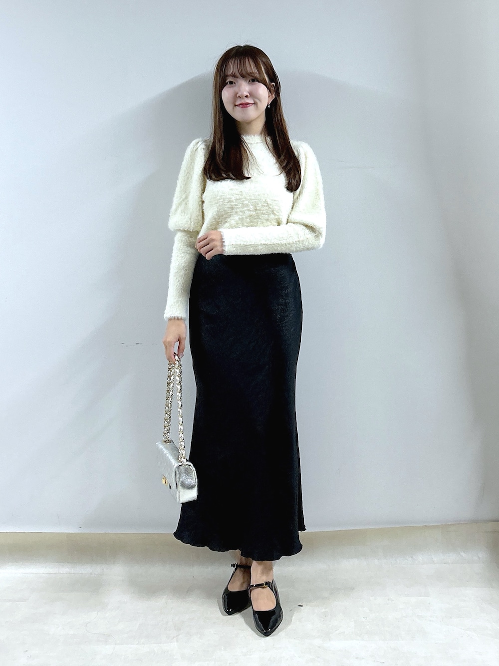 実はこのニット お花の形のスパンコールが埋め込まれてるんです! きらきらと動く度に輝いて可愛い。 ボリューム感のある記事ですが、腕のところはリブになってるのでスッキリきていただけます!