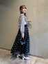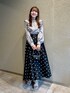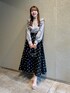 グレーのブラウスも、ドットスカートで女子っぽく♡ 肩のフリルが可愛すぎる。