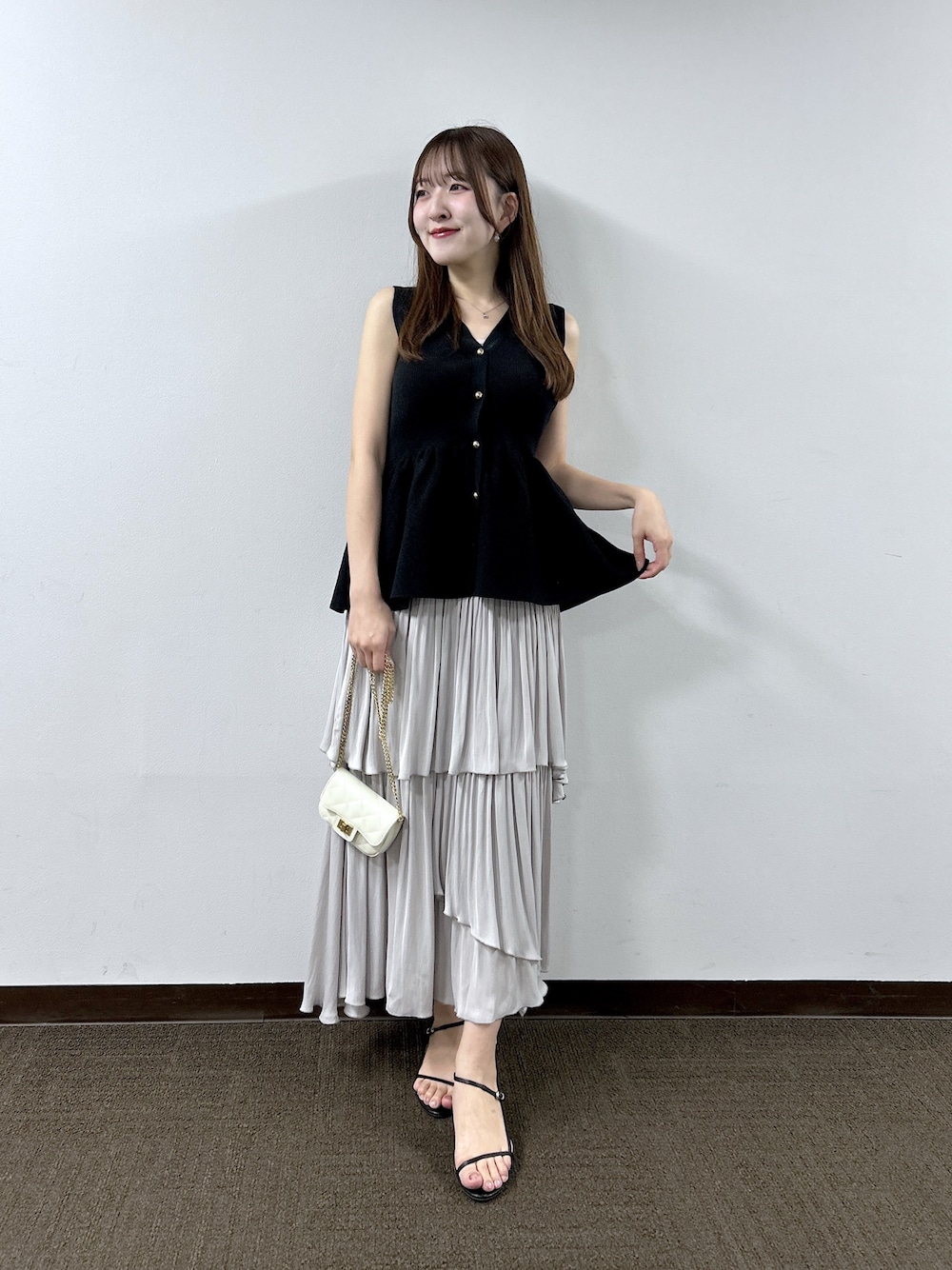 ゆるっと大人の上品コーデ♡ 【トップス】 大人気のペプラムニットにノースリーブが登場! 生地感は少しさらっとして、でもしっかりしたニット。夏でも着やすい生地感です! ペプラムの形キープしてくれるのがうれしい。 腰周りを隠してくれるので、気になるところもカバー。 落ち感のある、タイトめなスカートか パンツ合わせがおすすめです! 【スカート】 ティアードスカートデザインが目を引くスカート。 落ち感のあるシルエットで、 トップス選ばず着回ししやすい1枚です! リアルバイしましたが、 何にでも合うのでヘビロテしてます♥ オールシーズン使えるのもうれしい。 skirt♡38size