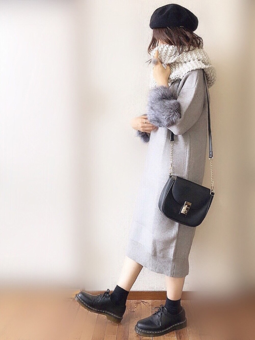 ぴょんのワンピース「目を惹く袖元。 リュクスなファーのニットワンピース」を使ったコーディネート