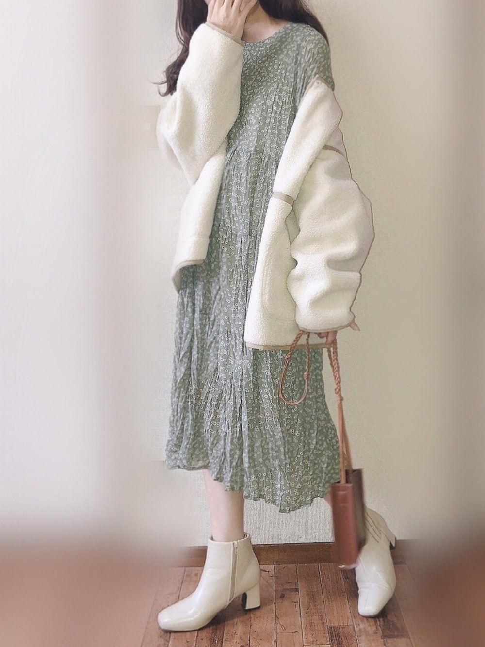 ぴょんのワンピース「ワッシャープリーツフラワーワンピース」を使ったコーディネート