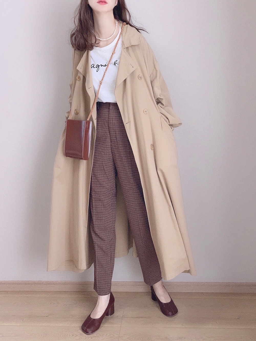 GUチェックテーパードパンツコーデ。 トレンチコートで大人っぽスタイルに♪ スクエアトウパンプスもヒールはありますがチャンキーヒールなので歩きやすいです✨ 見ていただきありがとうございます🙏 Instagram*pyon9494