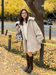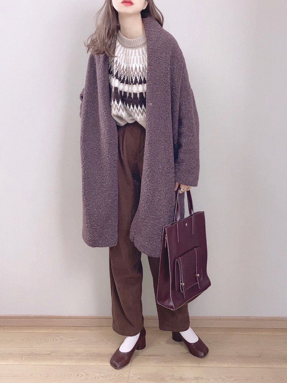 ぴょんのノーカラーコート「ボアニュアンスVネックコーディガン *◇」を使ったコーディネート