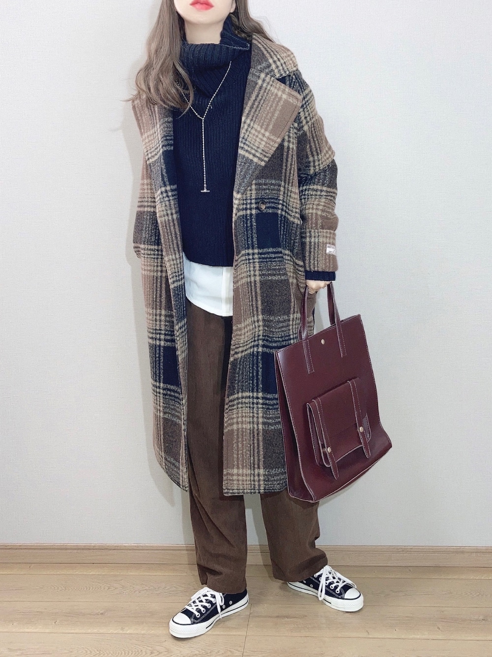 ぴょんのその他アウター「チェック柄ロールアップ袖ロングコート」を使ったコーディネート