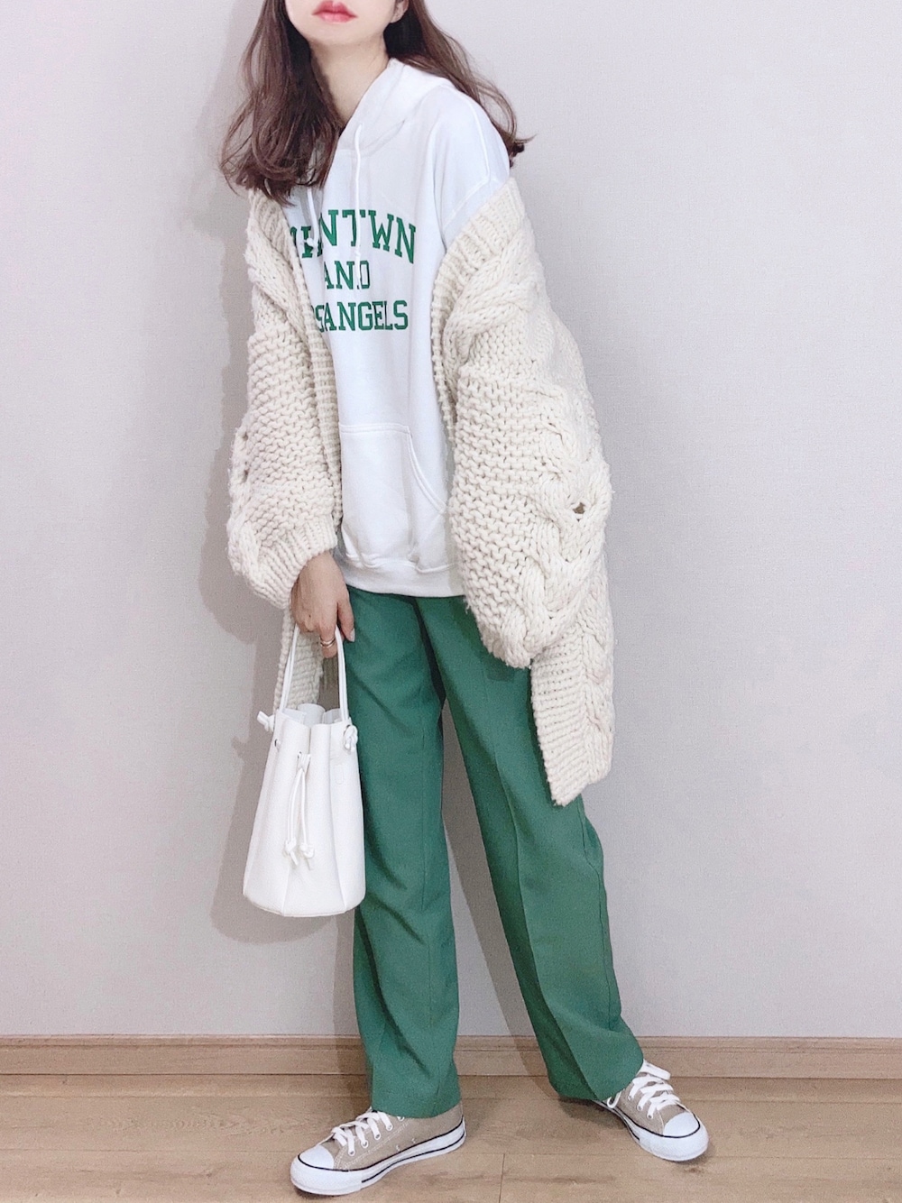 昨日ご紹介した、1月28日に販売されるロゴスウェット ホワイトバージョンコーデ。 春らしいグリーンパンツと合わせました。 バッグはしまむらのyumi.コラボ tal.by yumi.のカヌレバッグ👜 見ていただきありがとうございます🙏 Instagram*pyon9494