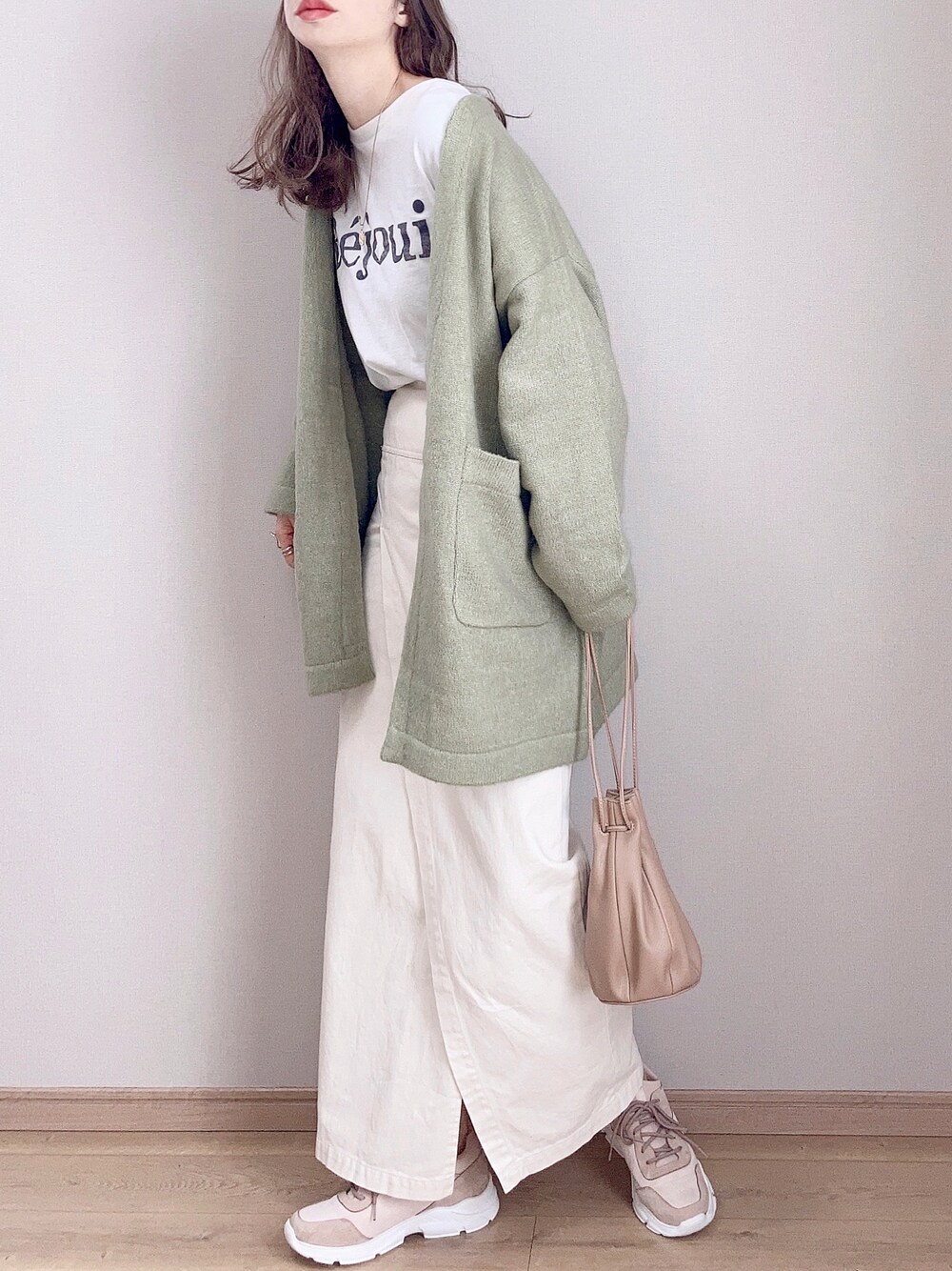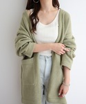 ぴょんのカーディガン/ボレロ「ミドル丈ふっくらブークレニットカーディガン」を使ったコーディネート