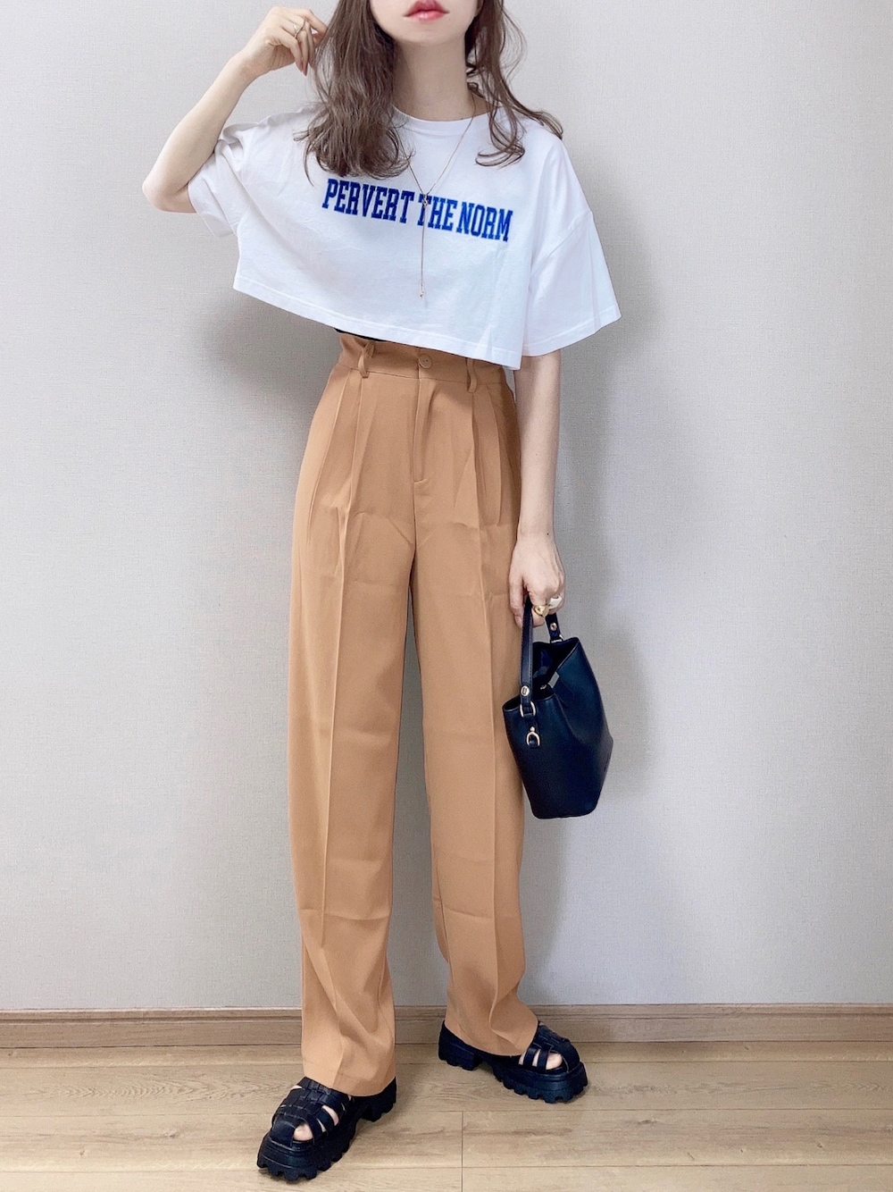 カラーパンツが新入りアイテムです♪ 短丈トップスと合わせると脚長効果が✨✨ 見ていただきありがとうございます🙏 Instagram*pyon9494