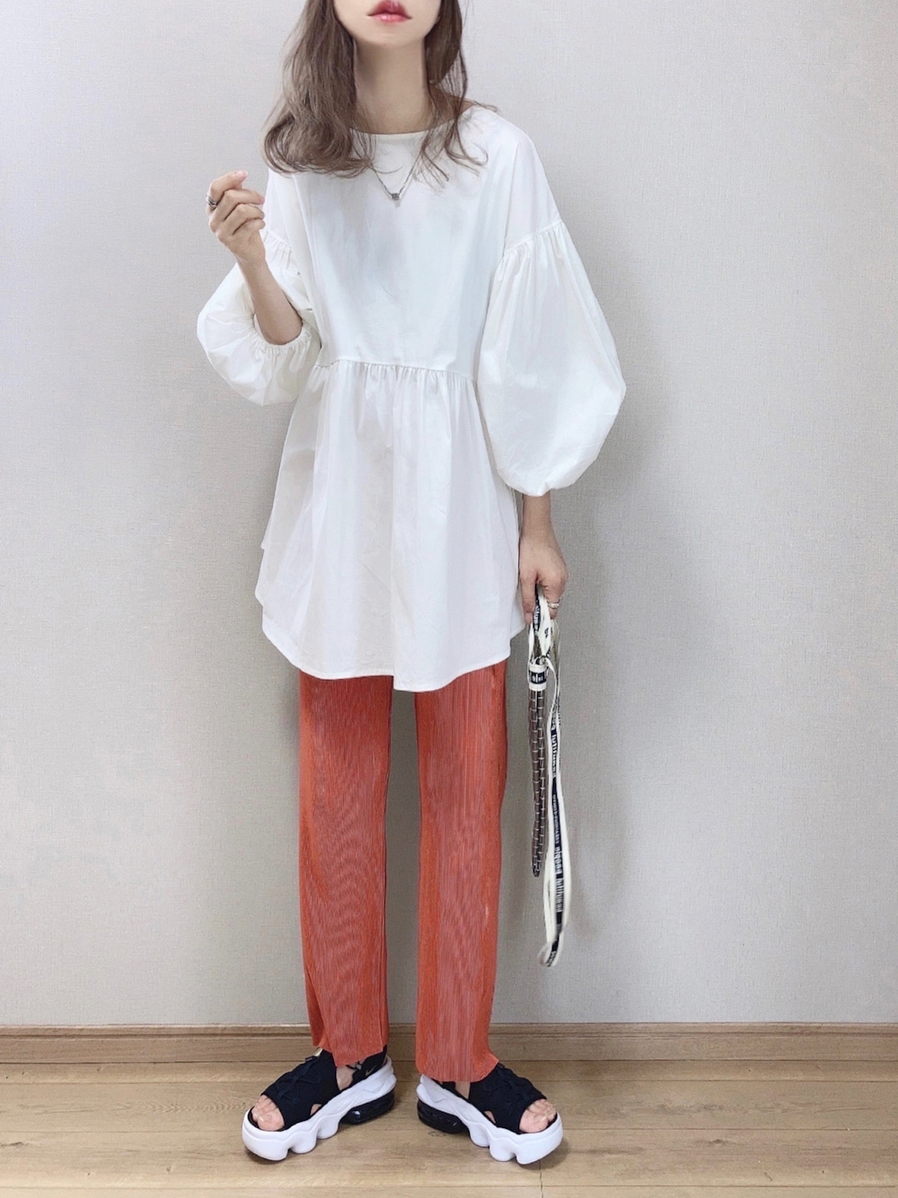 Bonjour Saganボリュームブラウスはお気に入り♪ AN CLOSETのプリーツパンツを合わせました! ビタミンカラーが夏らしくて可愛いです🧡 見ていただきありがとうございます🙏 Instagram*pyon9494