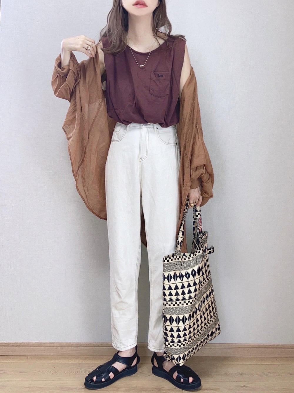 シアーシャツコーデ♪ まだまだ暑い夏真っ盛りだけど、早くも秋カラーが気になる♪ LeeのノースリーブTはお気に入りで実は3色買い💦 ブラウンも可愛い♡ bohmalのグルカサンダルは甲の編み目がゴツッとボリューミーで可愛いです♡ レザー風に艶感がある素材なので高見えもして◎◎◎🙆♀️ 見ていただきありがとうございます🙏