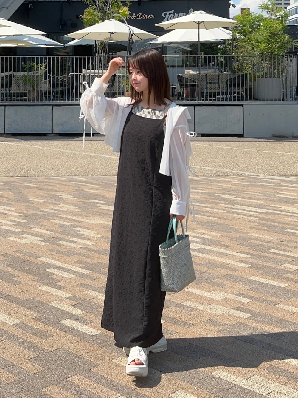 袖のボリューム感とリボンが可愛いシアーシャツ🎀 キャミもかごバッグの幾何学模様がリンクしてる気がする🫶🏻 🏷️Instagram:@pyon_chan___