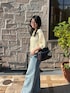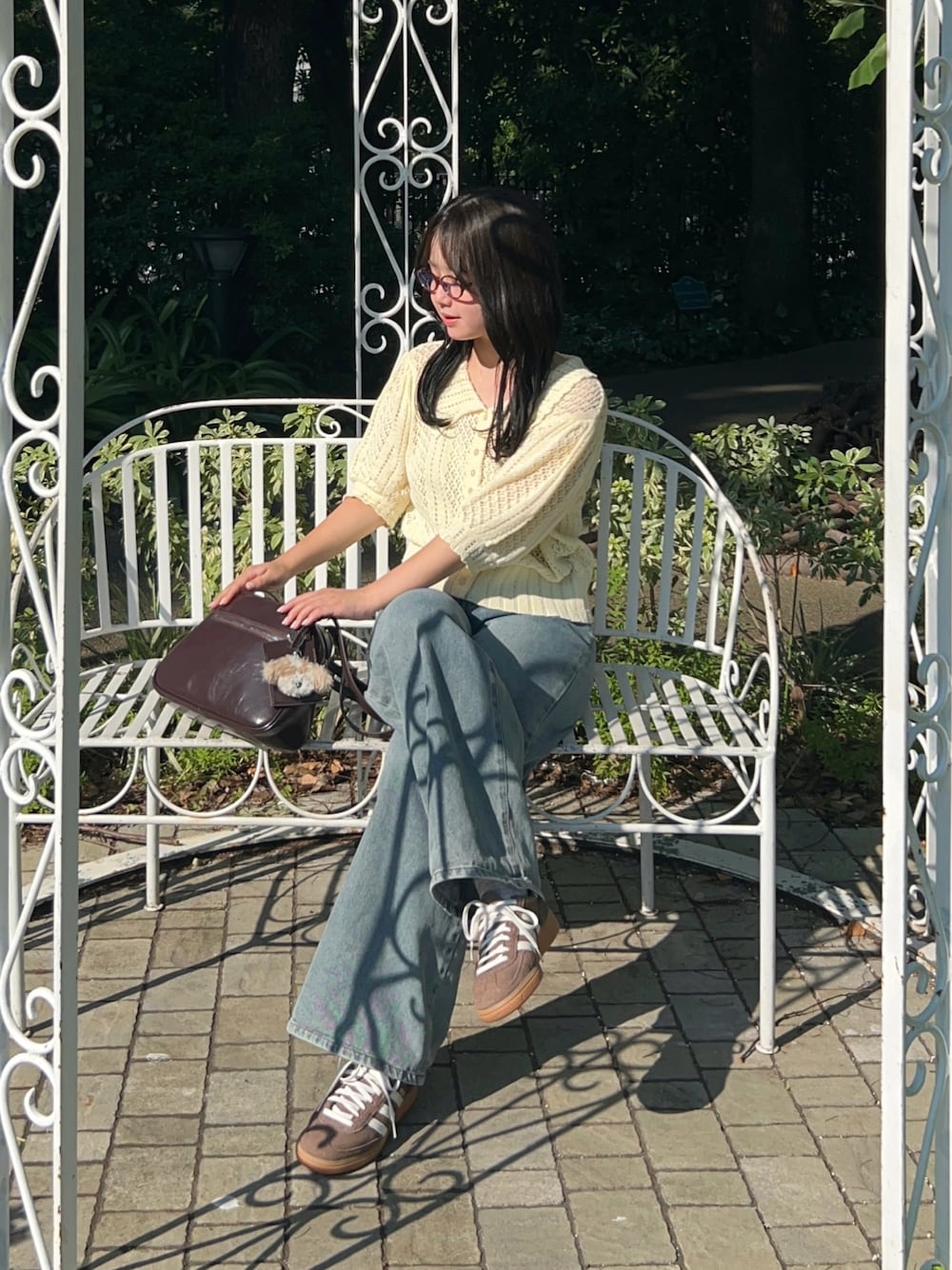 サマーニットにデニムを合わせたカジュアルコーデ🪄 小物はブラウンで揃えて統一感!✍🏻 べっこう柄のメガネがポイントになって可愛い🫶🏻 🏷️Instagram:@pyon_chan___
