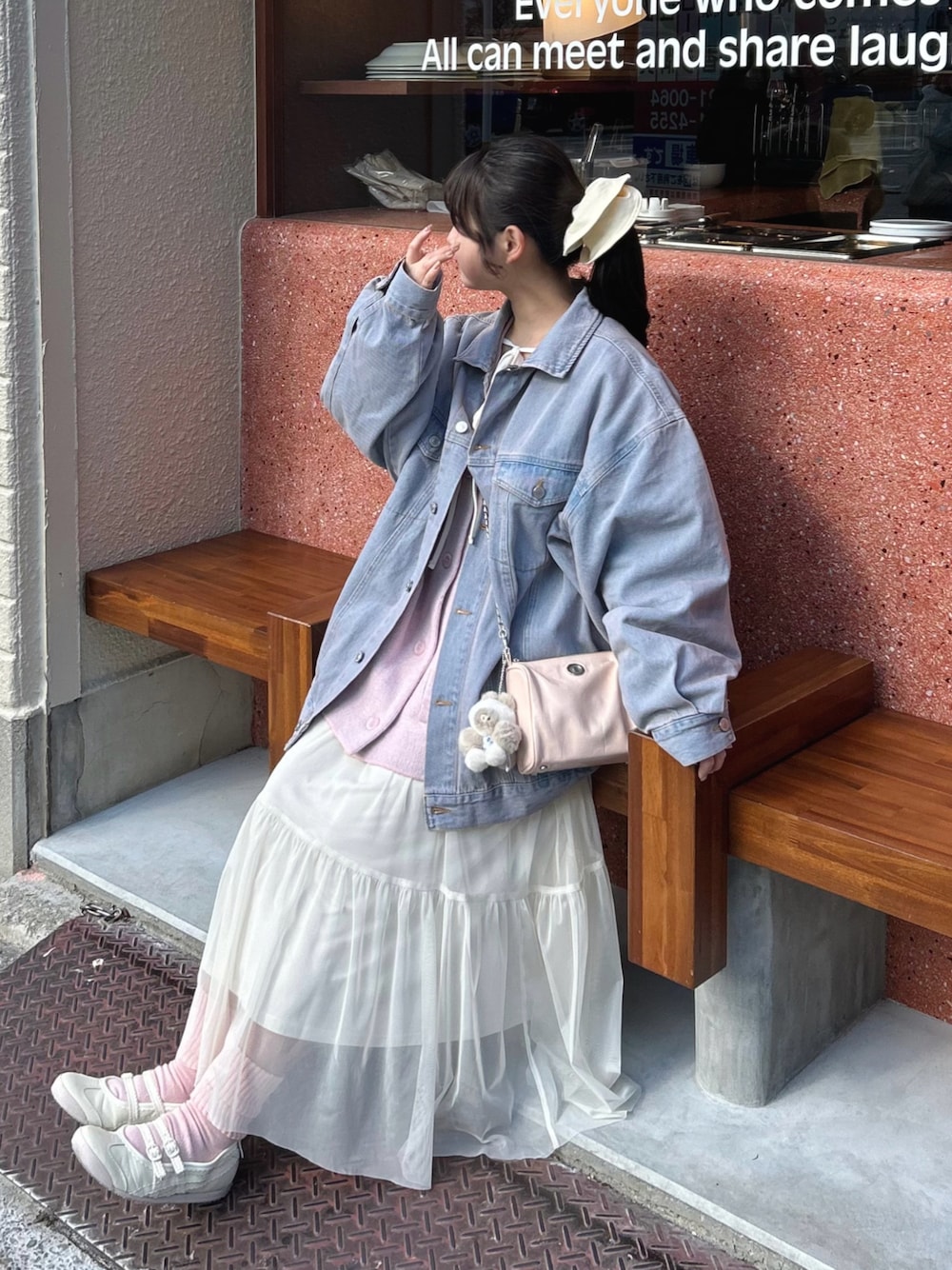 ピンクのデニムジャケットが春らしくて可愛い!♡ オーバーサイズなゆるっとシルエットもお気に入り🙂↕️💭 🏷️Instagram:@pyon_chan___