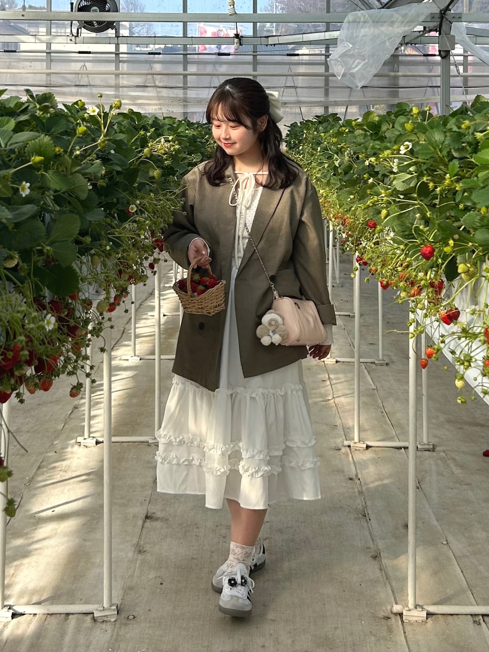 いちご狩りに行った日のコーデ⸝⋆ ドットのトップスとピンクのバッグで苺を意識💭🍓 ジャケットとガーリーなアイテムを合わせるの可愛すぎる🫶🏻 🏷️Instagram:@pyon_chan___