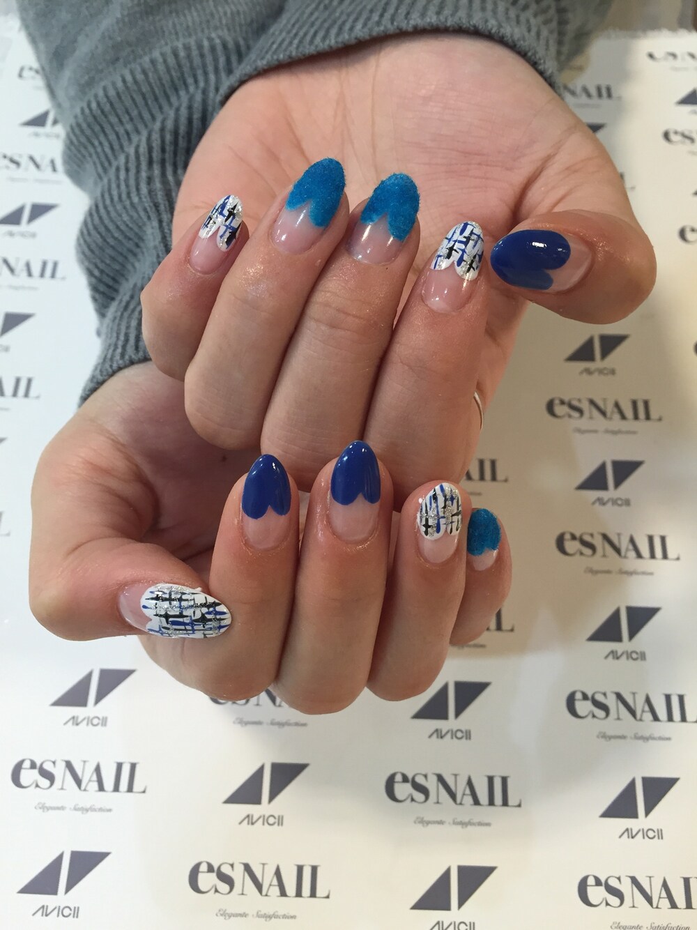 やっとネイル新しくしました♡ あゆちゃん大好きなので ハートネイル真似っ子〜!! 青系でまとめて、冬なのでツイード柄入れてもらいました( ˙˘˙ ) モコモコしてるのは今流行り?の ベルベットって言うやつだそうで。 今回も可愛く仕上がって幸せ(*˘︶˘*).。.:*♡