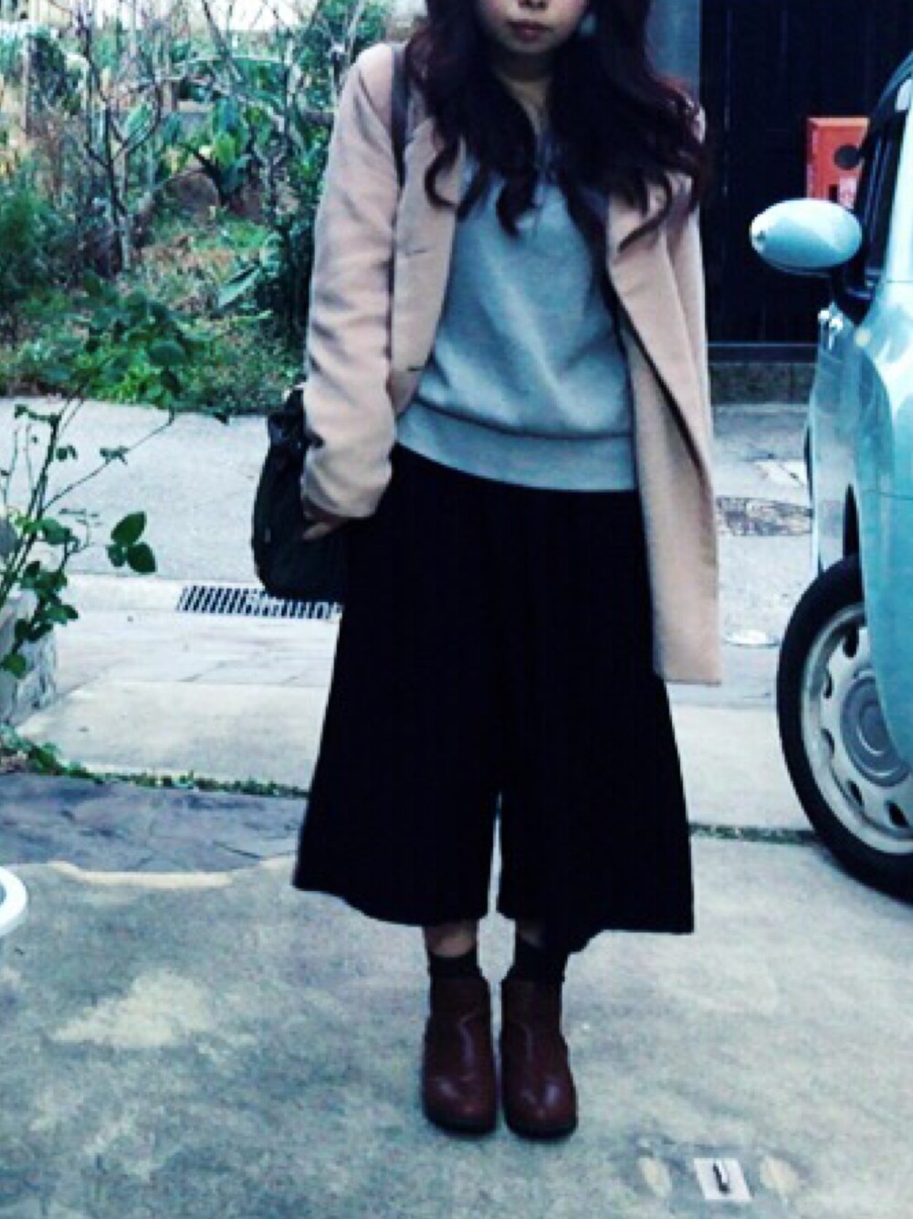 身長が低いので黒のガウチョだと 重たくなってしまうので、 トップスやコートは パステルカラーの明るい色で(^^)