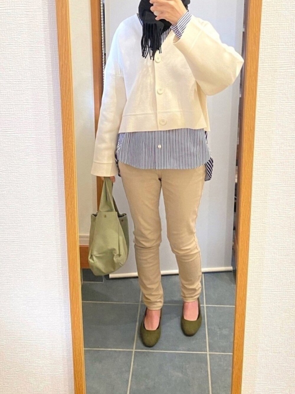 UNIQLO U のミラノリブVネックカーディガンと、 +Jのシャツを合わせてみました☺️ 映っていませんが、後ろもすごくかわいいです💕 相変わらずユニクロずくし👐🏻