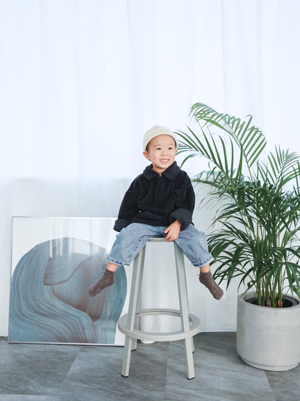 この格好が最近お気に入り👦🏻♡ トップスは6Yサイズで ぶかぶかのオーバーサイズ☺️ ここで写真撮るのが好き♡