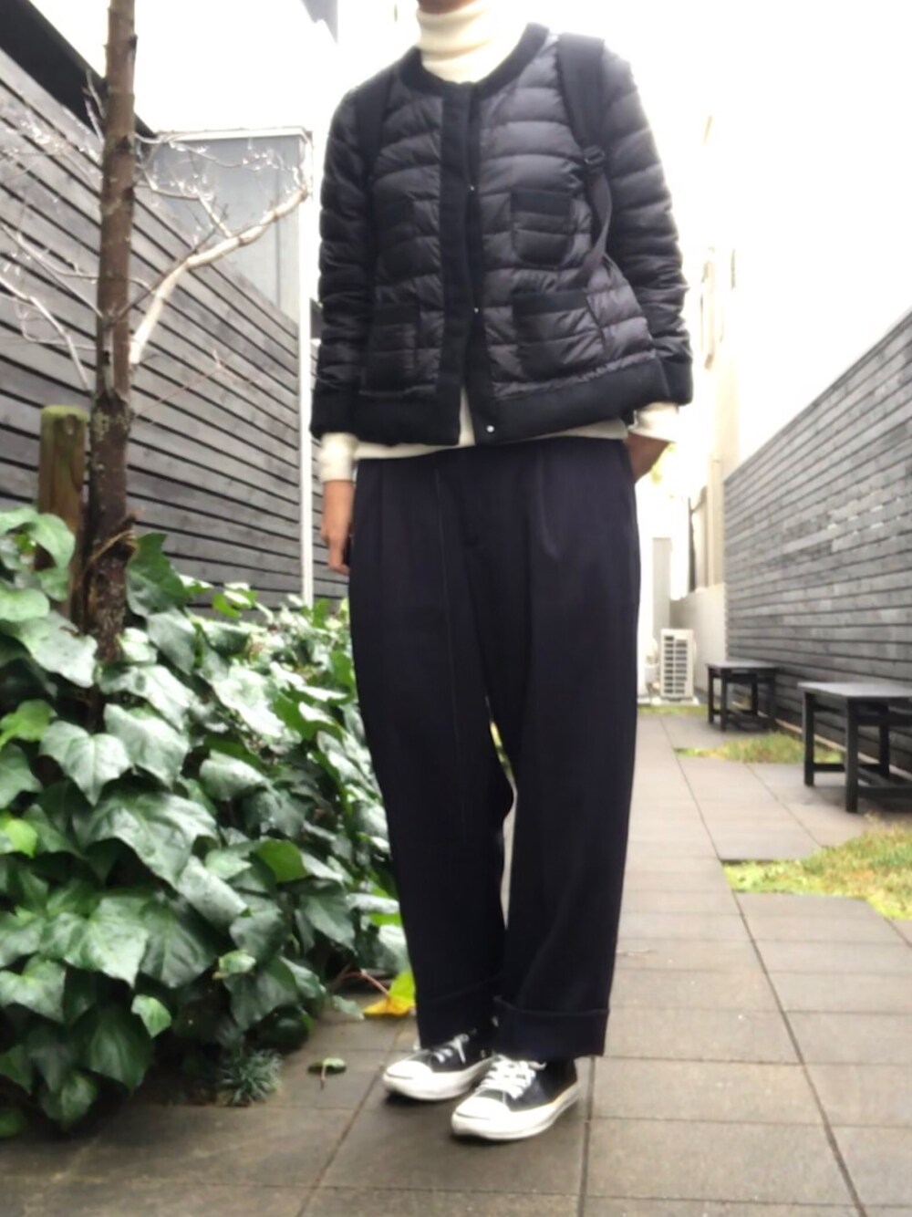 ワイドパンツの女のダウンジャケット/コート「【WEB限定】 西川ダウン/ノーカラーブルソン」を使ったコーディネート