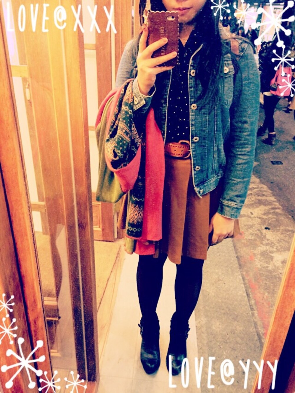 今天立刻想辦法搭了前天在做作古著買的牛仔外套! 比起大衣的厚重,牛仔外套顯瘦又保暖, 幾乎不管搭什麼都很好看! 超冷冬末就靠它了... 有了外套修腰,就可以放心搭配其實很顯胖的高腰裙了XD 外套:做作古著 襯衫:裊裊 裙子:市集