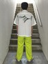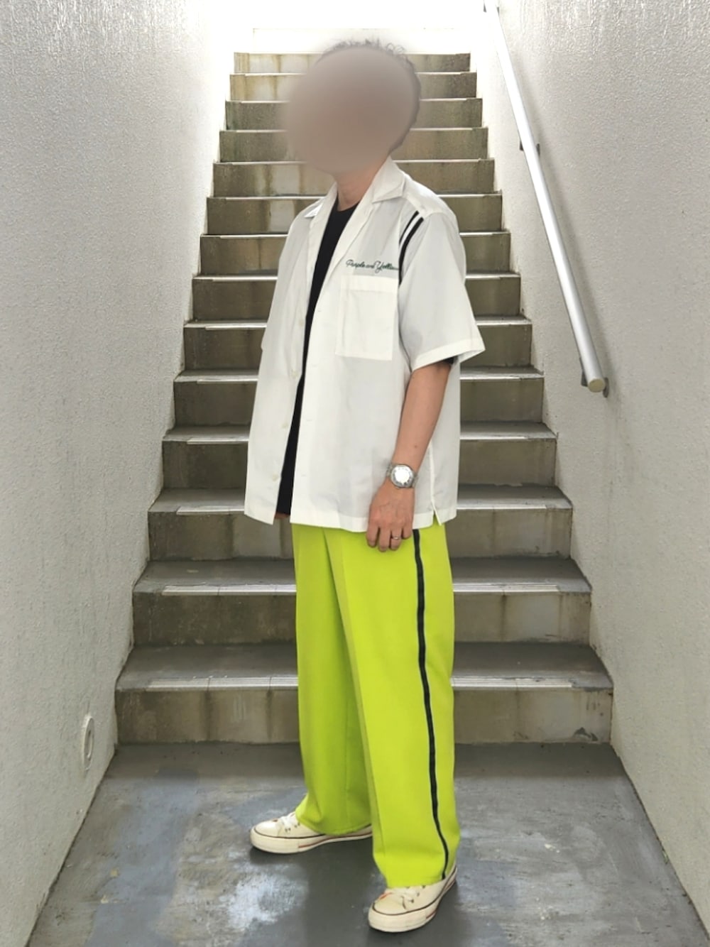 目立つかなと思って購入したラインパンツ。 ラインの緑と、ボーリングシャツの緑文字を合わせてみました!