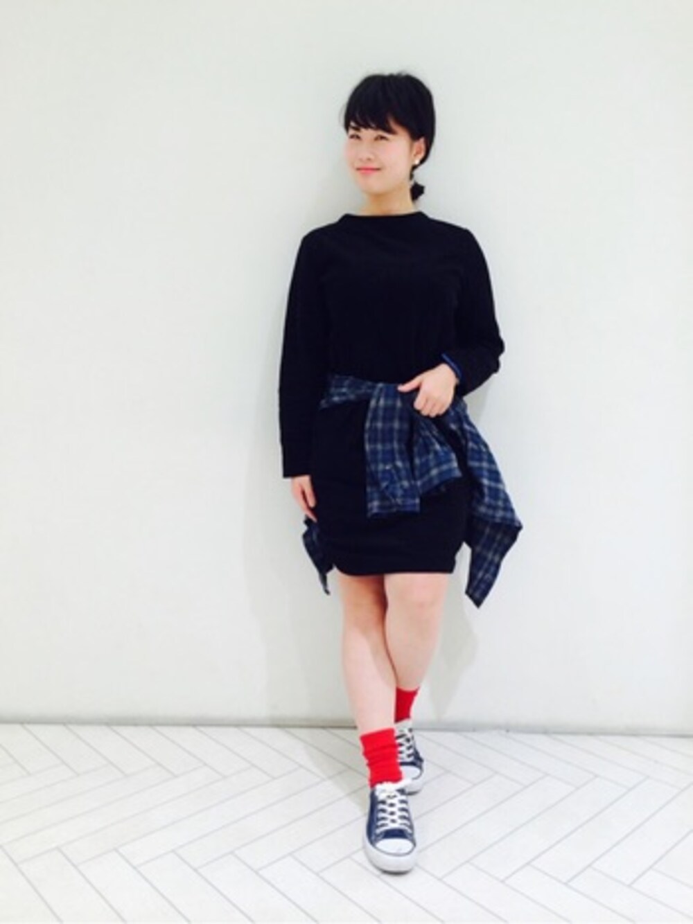 シンプルワンピースを腰に巻いたシャツと、赤い靴下でアレンジ!