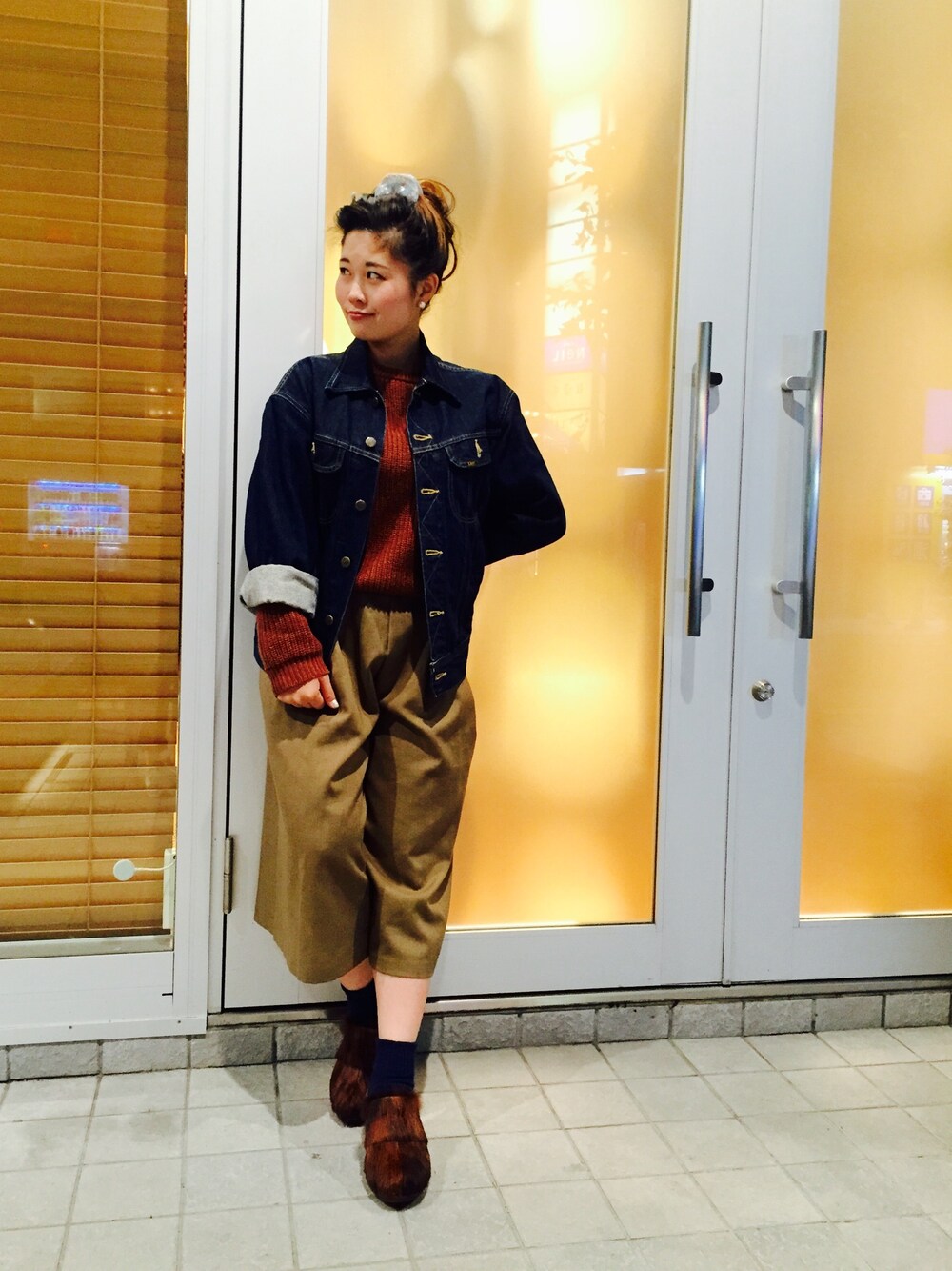 ワイドパンツを履くときは目線を上に、お団子ヘア。 ファーのサボがお気に入り♡