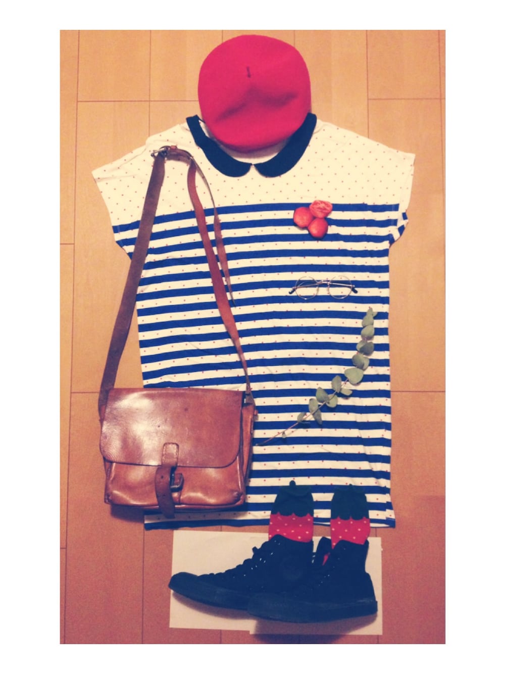 写真では分かりにくいですがワンピースのドットは赤です。ちなみにヘタつき靴下はイチゴです。笑 柄と赤を主体にすると何ともカオスポップなスタイルになりました…笑( ✧≖´◞౪◟≖`) キラッ