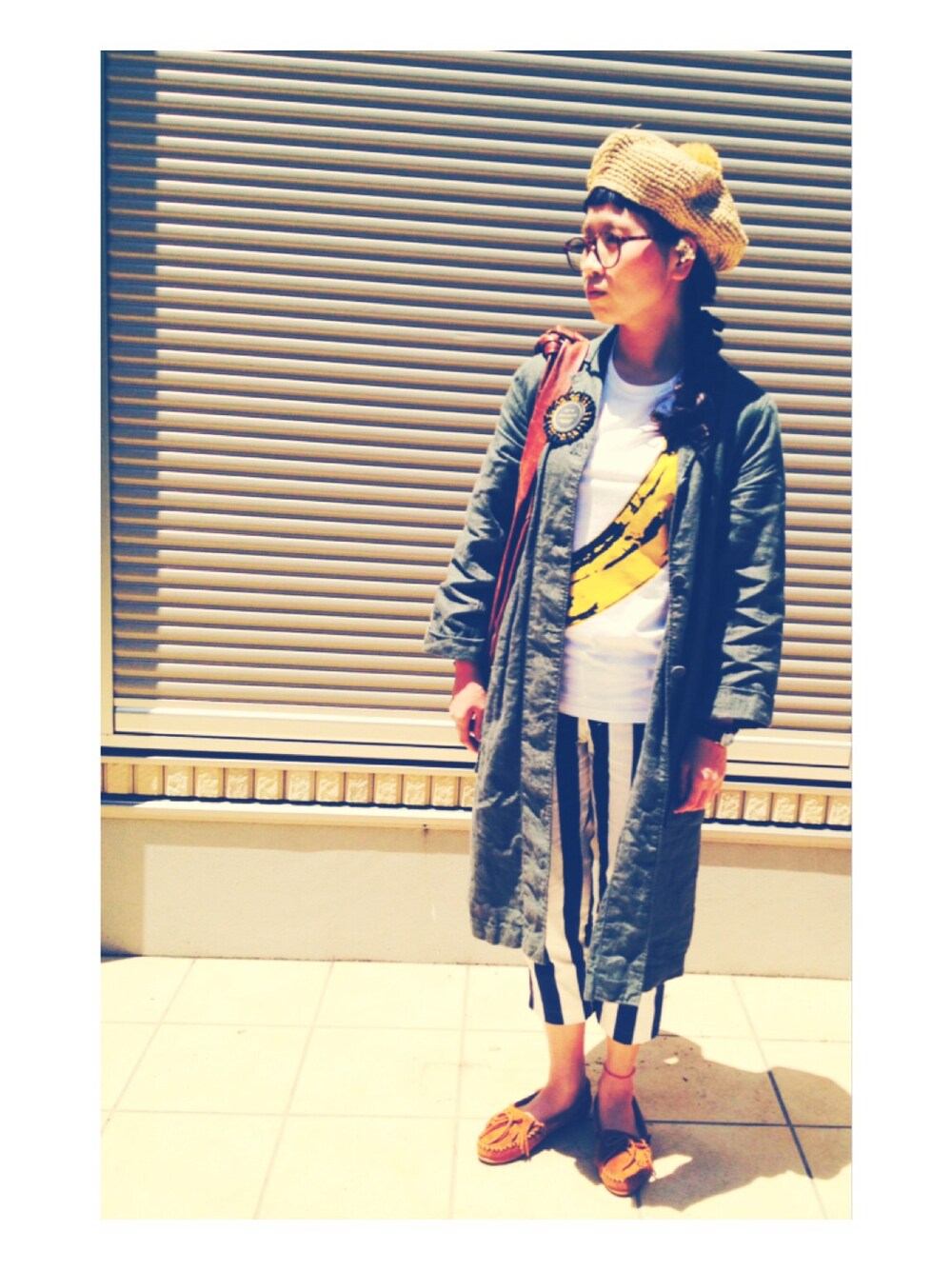 帽子:BEAMS BOY メガネ:楽天 鞄:古着 コート:studio clip Tシャツ:UNIQLO パンツ:BEAMS BOY 靴:ミネトンカ
