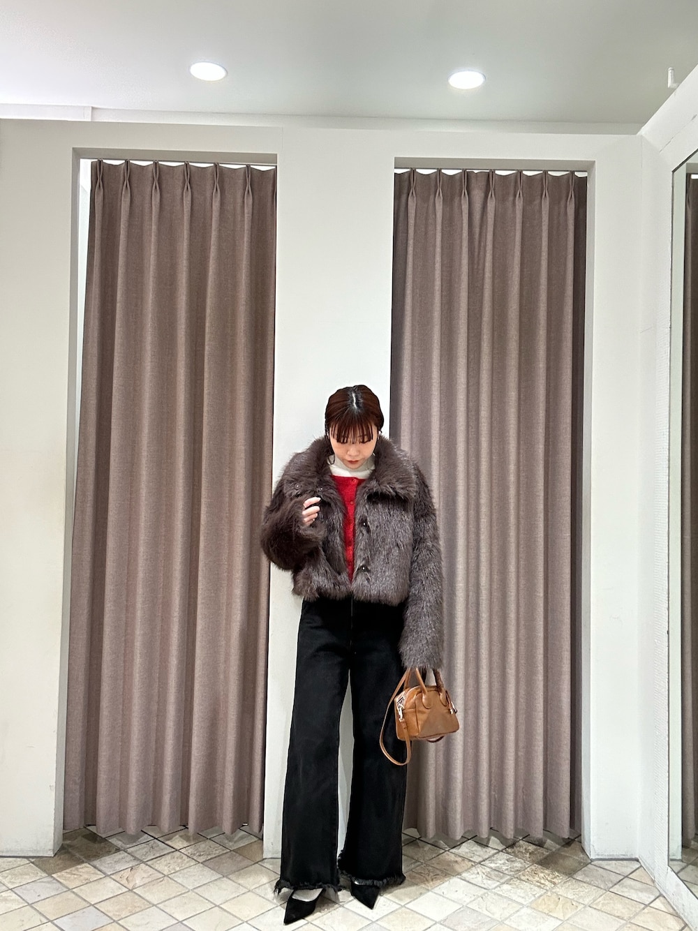ふわふわのファーコートは ショート丈でスッキリと着られます! 赤やファーで クリスマスシーズンにもおすすめなコーディネートです◎