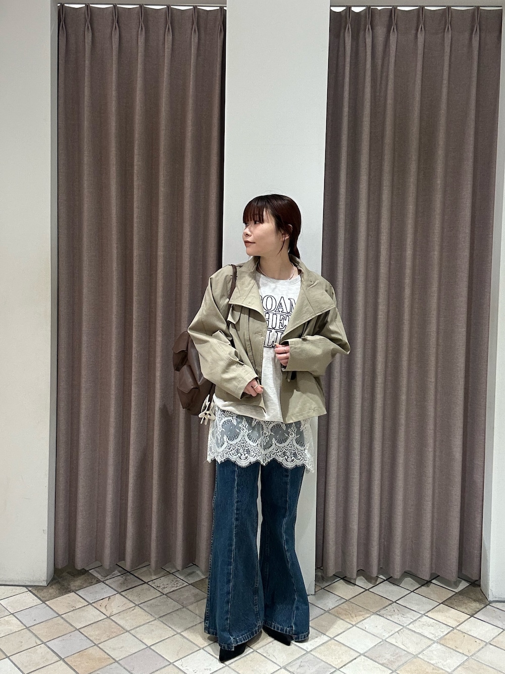 【着用サイズ】 デニム 1 ショートトレンチから出る 裾のレースがポイントです◎ デニムとスウェットに レースを入れると一気に華やか おでかけコーデに♡ トレンチがショート丈なので スッキリとしたコーディネートになります!
