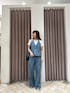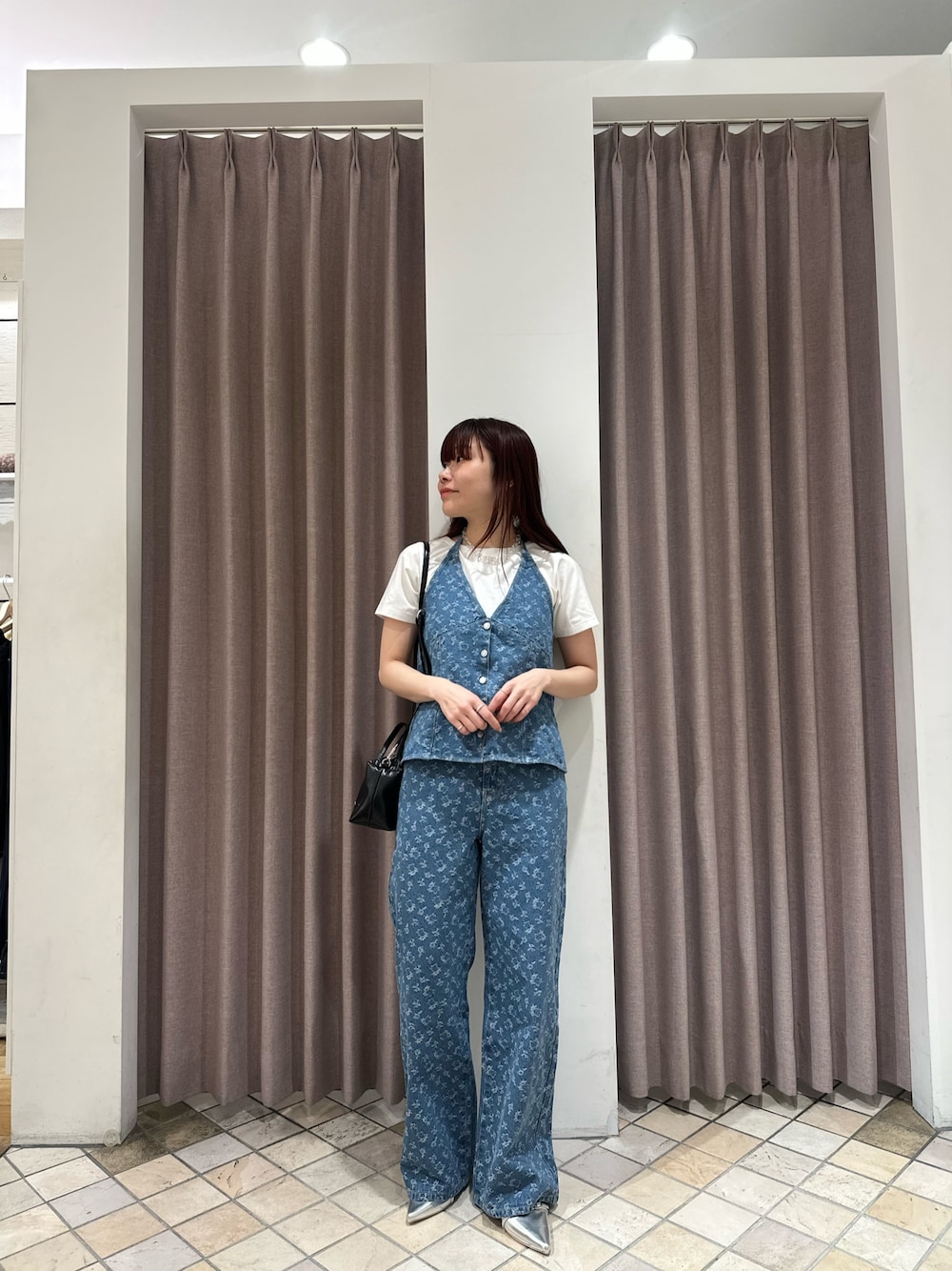 【着用サイズ】 パンツ 1 シューズ 37 プリントが新鮮な デニムのsetupはカジュアルですが 花柄なのでTシャツ合わせも華やかに 女性らしく着られます! パンツのシルエットはゆったり ワイドめですが、太すぎず 足のシルエットを綺麗に見せてくれますよ! ホルターデザインが華奢見えも叶う シルエットのトップスなので ボリュームのあるスカートなどにも 合わせられるアイテムです!