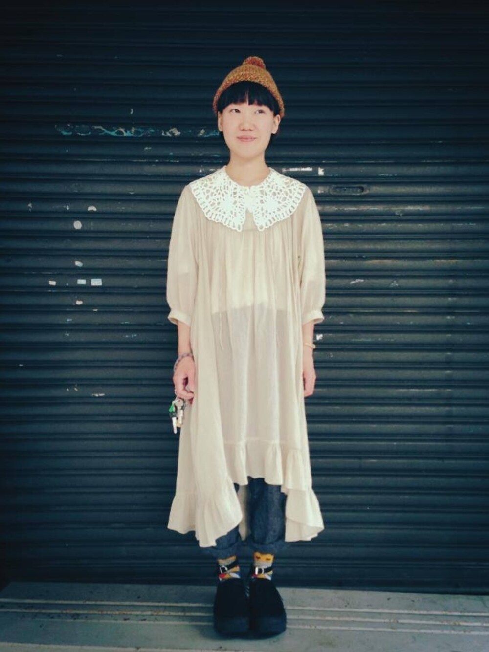 ベージュ系のワンピースを着用したレディースの夏コーディネートの1枚目の写真