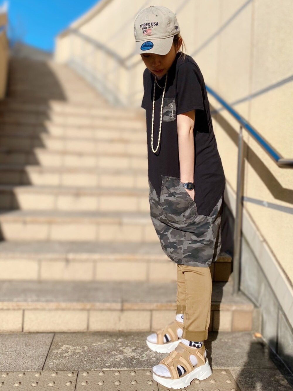 きゃらさわ(AVIREX なんばパークス店)のキャップ「AVIREX×NEW ERA/ アヴィレックス×ニューエラ/ 9TWENTY/ POLO CAP AVIREX U.S.A FLAG/ ポロキャップ AVIREXアメリカ国旗」を使ったコーディネート