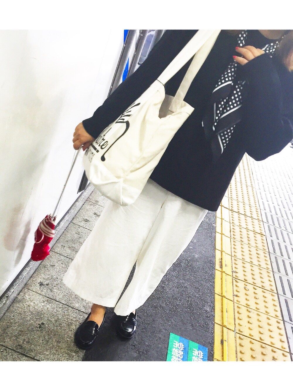 * * モノトーンでさらっとまとめてみました🌷 * モノトーンでシンプルになりすぎてしまわないように、 お母さんにもらったドットのスカーフをくるっと巻いて コーディネートしました💓