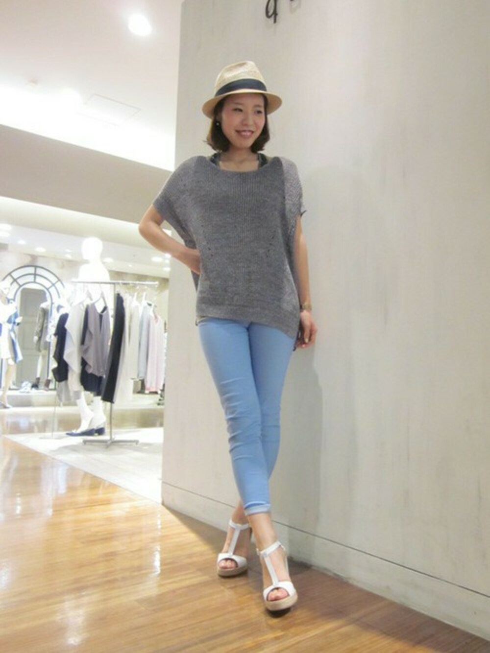 昨年も大人気だった麻素材のニットが今年も登場!! 大人リゾートスタイルにしてみました☆ ローゲージニットでも、ややコンパクトなニットなら ルーズすぎず、大人に着ていただけるのでオススメです。