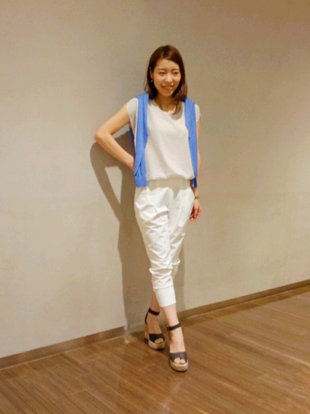 爽やかコーデにしてみました。 さらっとしていて履き心地が抜群な大人気のタックパンツです! 裾に向かって細くなるデザインなので、 足首をちらっと見せて履くスタイルもオススメです☆