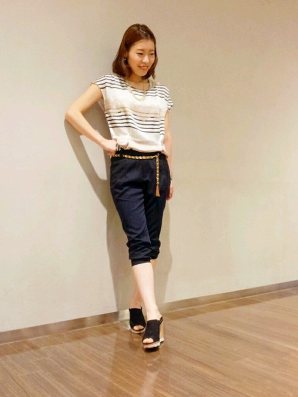 きれいめカジュアルコーディネートにしてみました。 チェーンベルトとセットのパンツは、 ツヤがあるので、きれいめな印象でかっちりお仕事コーディネートにも大活躍! 柔らかい素材でさらっとしているので、履き心地抜群です! 丈の調節もしやすいシルエットなので、イメージを変えて使い回しがしやすいですよ☆