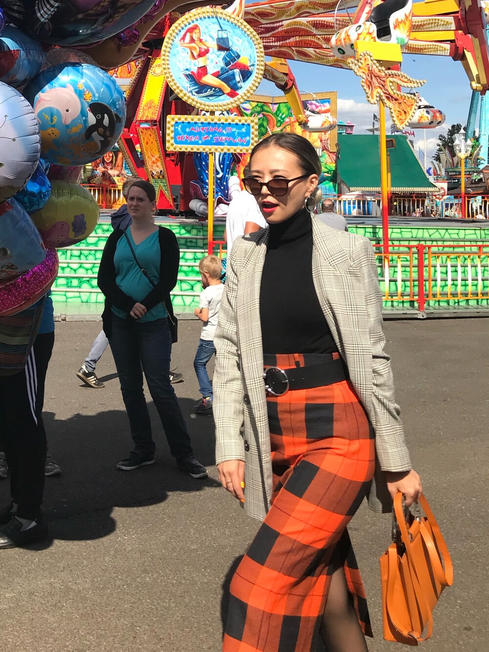 ベージュ系のスーツジャケットを着用したレディースの秋コーディネートの1枚目の写真